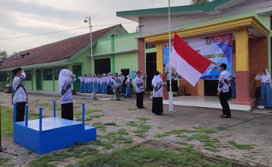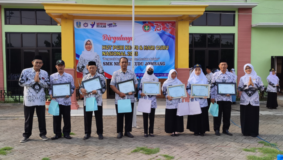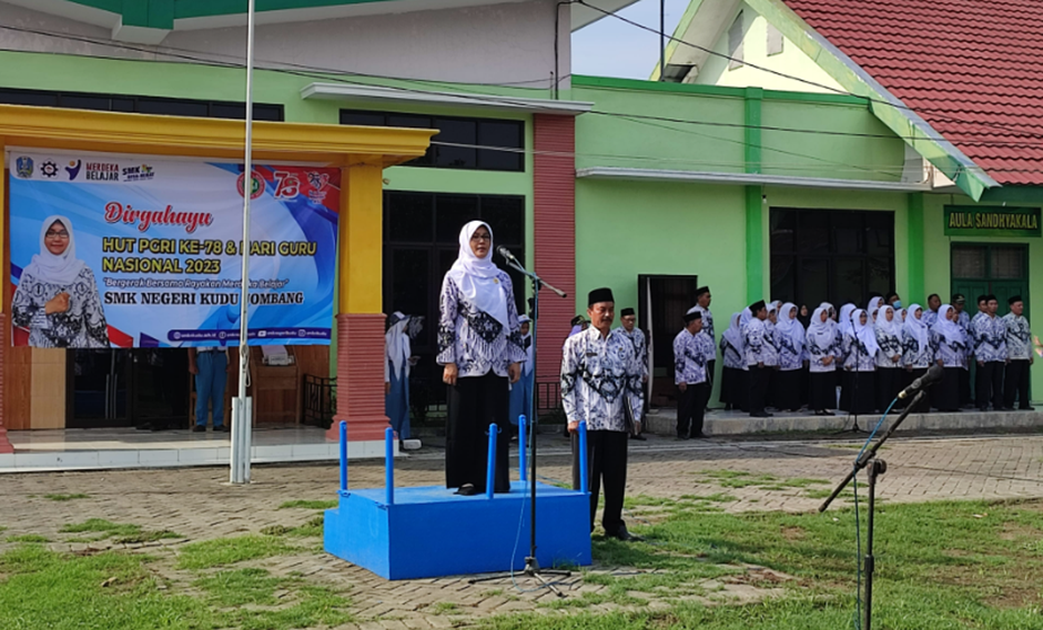 Puncak peringatan HGN 2023 dan HUT 78 PGRI dilaksanakan dengan upacara bendera 27/11/2023 dengan pembina upacara Kepala SMK Negeri Kudu, Ibu Amiroh, S.Kom., M.Kom. Upacara yang diikuti oleh semua siswa guru dan karyawan SMK Negeri Kudu ini berlangsung di lapangan upacara SMK Negeri Kudu dengan petugas upacara bapak dan ibu guru. Suasana hikmat saat upacara mengesankan bahwa peringatan HGN tahun ini menjadi titik tolak untuk maju melesat sistem pendidikan di Indonesia.